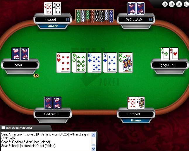 The turn is definitely my card making my straight come true and giving hazzeri set of sevens. He betted the pot again and surprisingly for me the very passive gege1977 re-raised. I was more than confidant to go all in and the other two paid me.